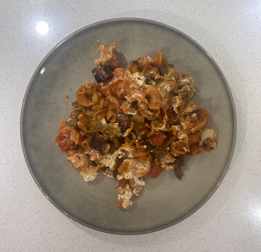 - Remove the roasted vegetables from the oven, then reduce the temperature to 200 degrees C. Tip the roasted aubergines into the roasting tin of tomatoes, then add passata, and torn basil leaves; season. Stir in the drained pasta until coated. In a large bowl, combine the crème fraîche, milk and 1/2 the cheese, then spread over the pasta. Cover with the remaining cheese and bake for 20 minutes.