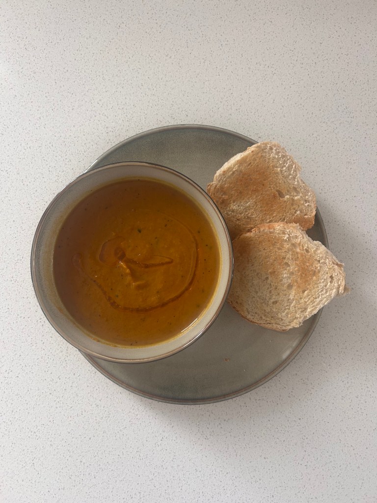 - Preheat the oven to 200ºC. Peel the butternut squash and cut into large chunks;; put in a roasting tin with the onions and carrots. Toss everything the the oil; season. Put in the oven fro 35-40 minutes, until all the vegetables are lightly charred and cooked through