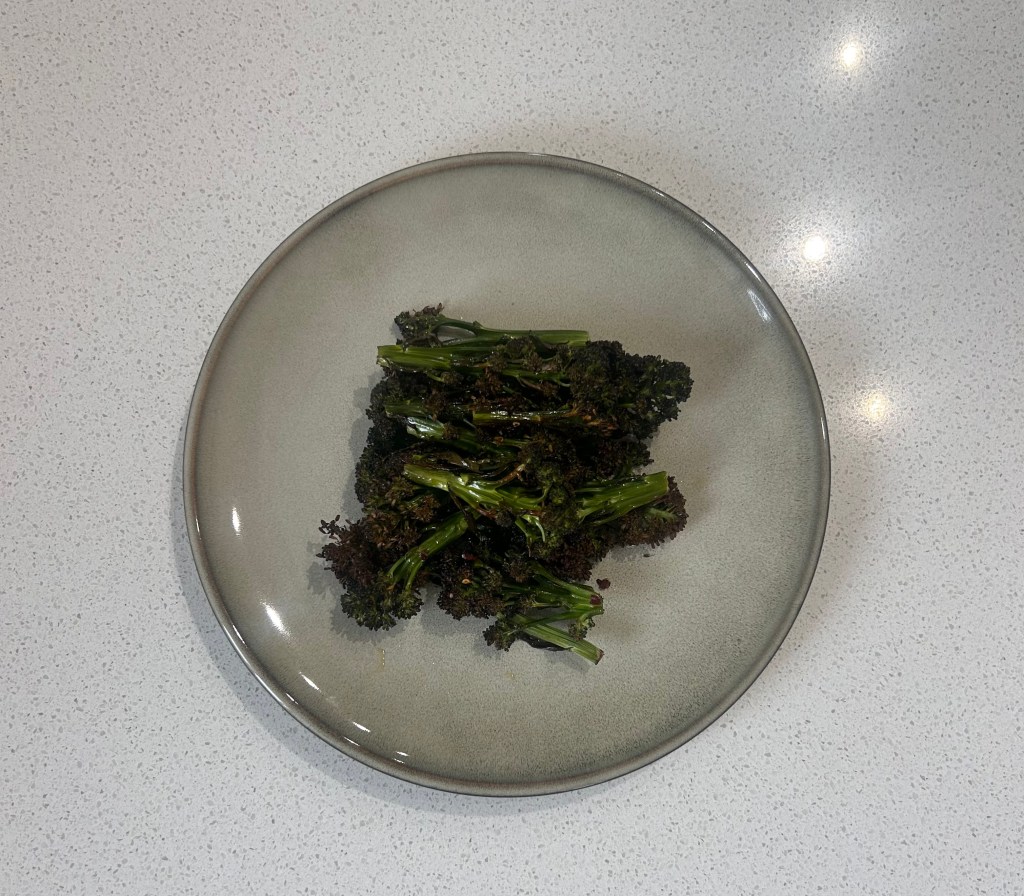 - Preheat the oven to 200C. Cu the woody ends of the broccoli and halve any thicker pieces lengthways. Put a single layer in a large roasting tin, drizzle with the oil and season Sprinkle over most of the chilli flakes and toss, then roast for 15 minutes until charred and cooked through.